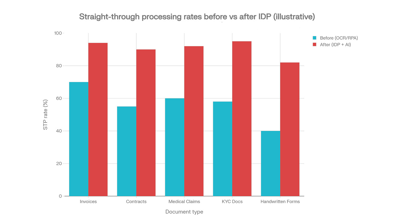 The grouped bar chart I shared shows a realistic pattern: STP rates moving from around 40–70% with basic OCR/RPA to roughly 82–96% with well‑implemented IDP across invoices, contracts, medical claims, KYC, and handwritten forms. That lines up with case studies where invoice and claims STP end up in the 75–90% zone after tuning, not on day one.